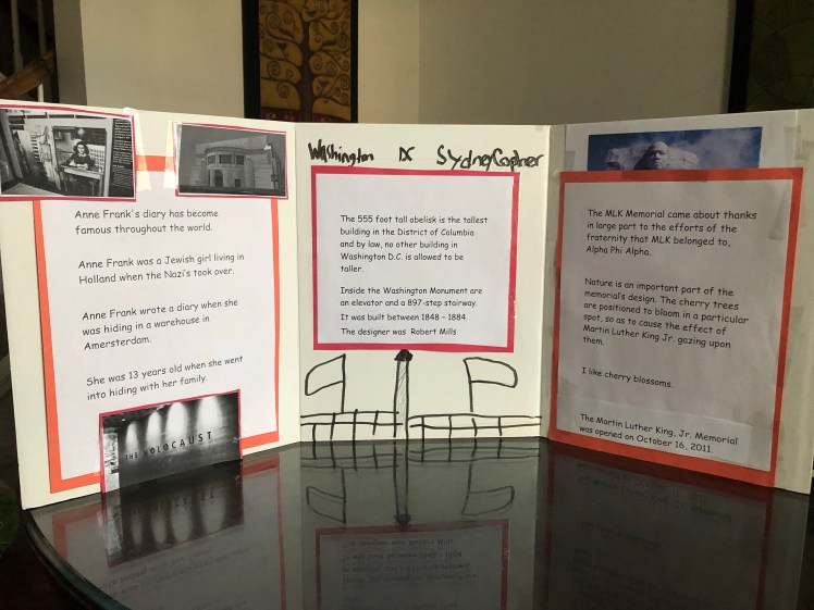 After reading the choices to her. Syd picked creating a poster. The problem was when it was time to find facts about Washington, DC. She kept repeating “No DC. No DC.” She didn’t want to do the report and started writing about The Ten Commandments on the poster board.