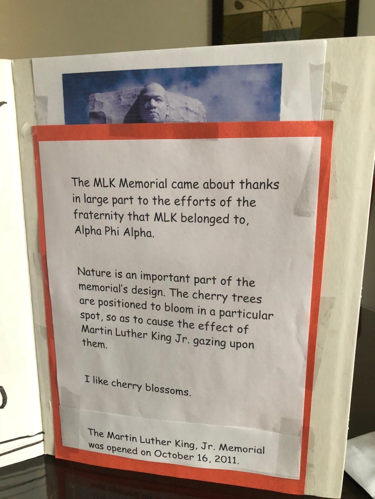She gave me attitude and I gave it right back to her. I like how she added her personal touch to the poster. The fact that she likes cherry blossoms near Dr. King’s memorial.