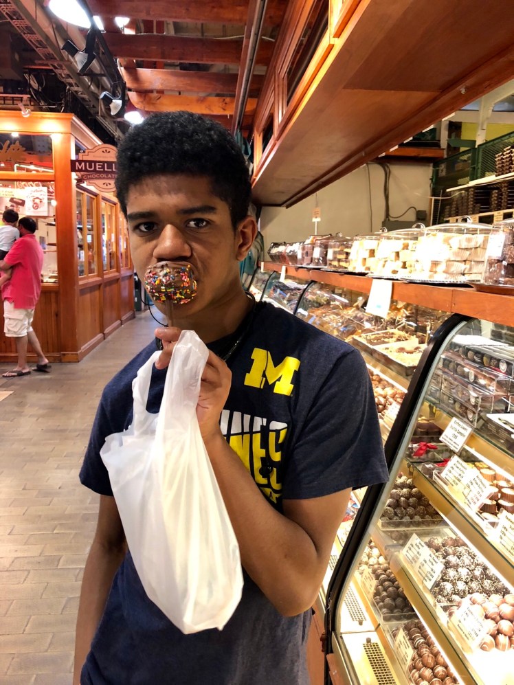 It was hard to choose from the donuts, sandwiches, ice cream, or fudge. Harrison enjoyed ice cream and chocolate covered marshmallows with sprinkles.