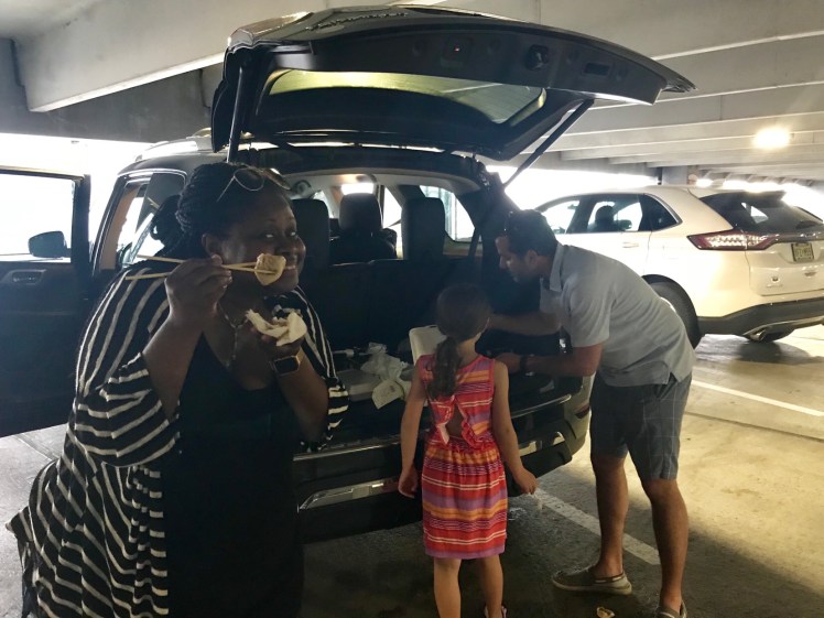 I think the best part of my Philly experience was dumpling tailgating in the parking garage. These dumplings were fantastic. The dumplings had pork, vegetables, and broth inside. I’m glad the kids didn’t want dumplings. That meant more for us.