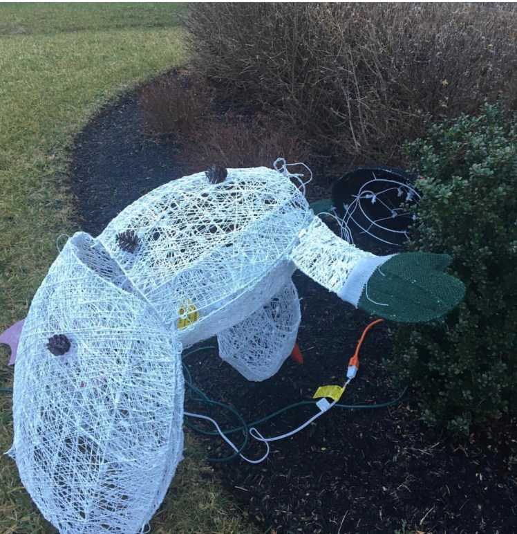 Cue Frosty, our outside decoration. I feel like Frosty looks, so exhausted and my head is spinning. It’s a tired that I can’t put into words properly. All I wanted for Christmas was Frosty, a little decoration to add outside our home. Tonight is our Christmas party and I wanted it to look nice. Now I have a headless snowman that lost his battle with the winds of Delaware this past week. Harrison thought I was crazy when I told him to bring Frosty inside last night so I could operate on him.