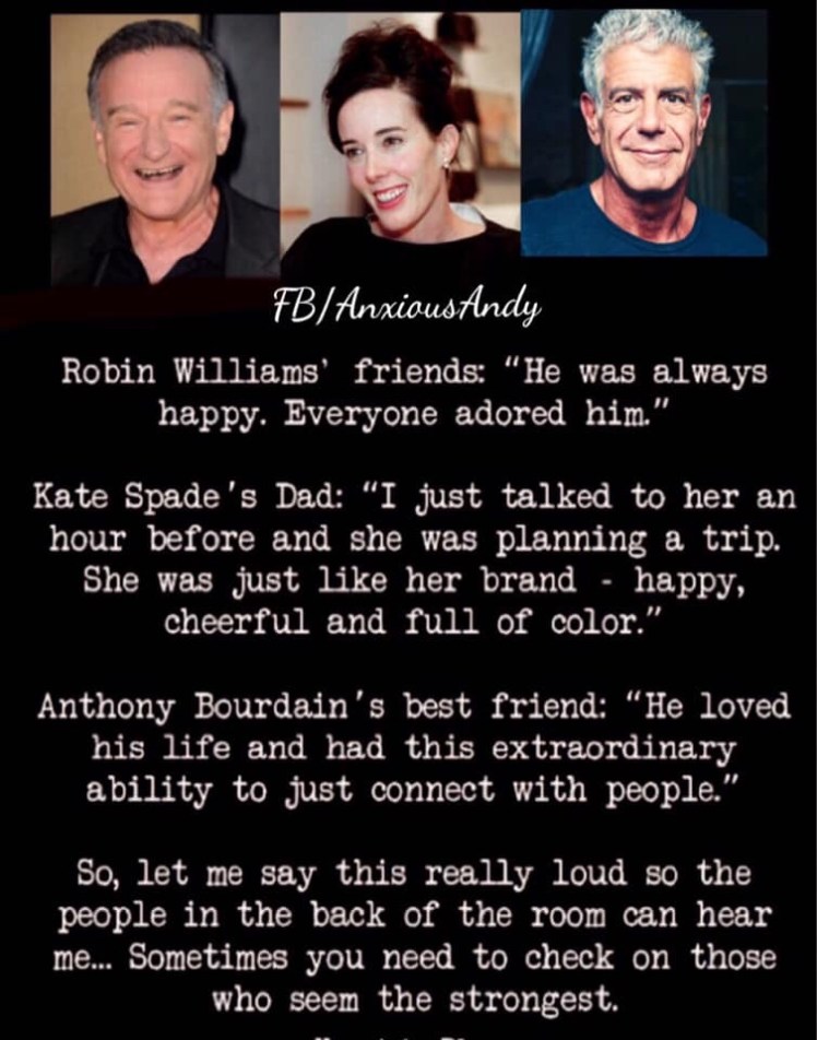 I’m not trying to be Debbie Downer, I just want us all to remember to check on our friends and if they are reaching out for help, acknowledge them not belittle them, or if you notice signs, please take them seriously. We may not have all of the answers but we can help them find the right people to talk to and get them the help they need.