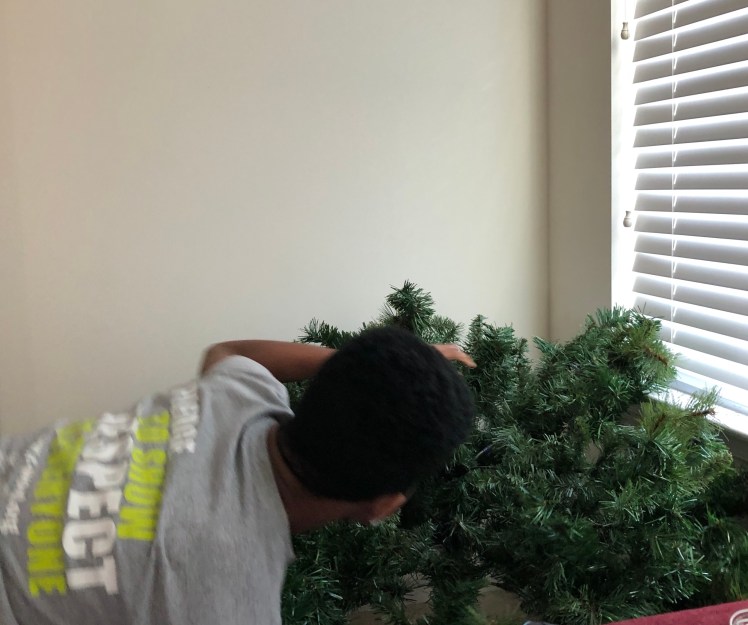 Harrison is not on board with our plan. He even said I should go and buy Thanksgiving decorations!!! He stopped watching the Michigan football game and brought up the tree from the basement and put it up for us.